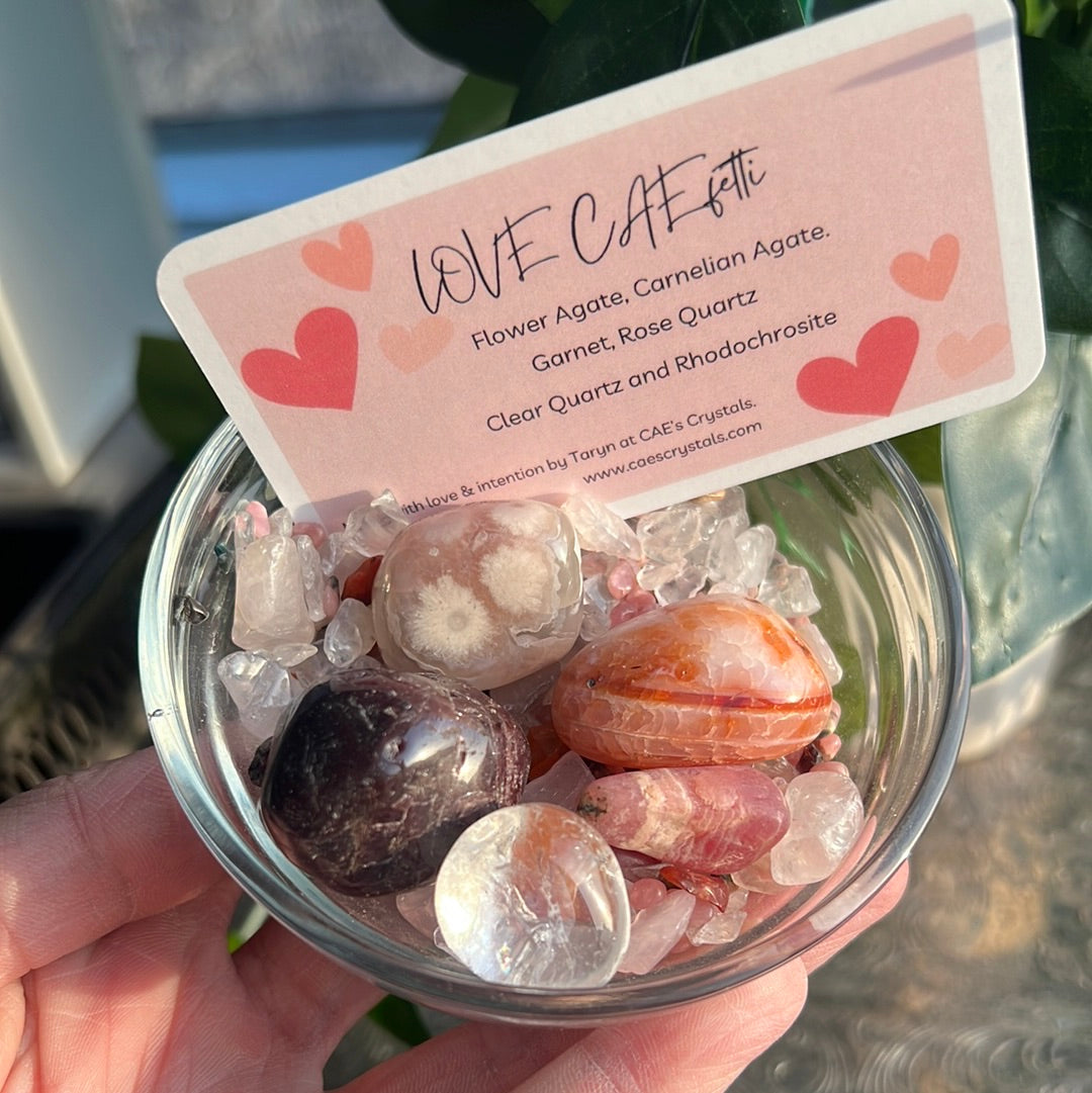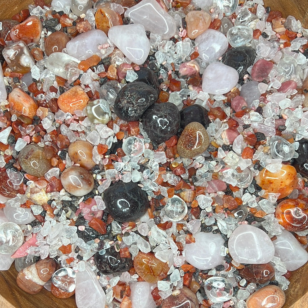 Experience the power of love with this crystal mix. Each crystal is carefully selected to enhance love, passion, and intimacy. Let these crystals help you attract and maintain a loving relationship with your partner, friends or yourself
